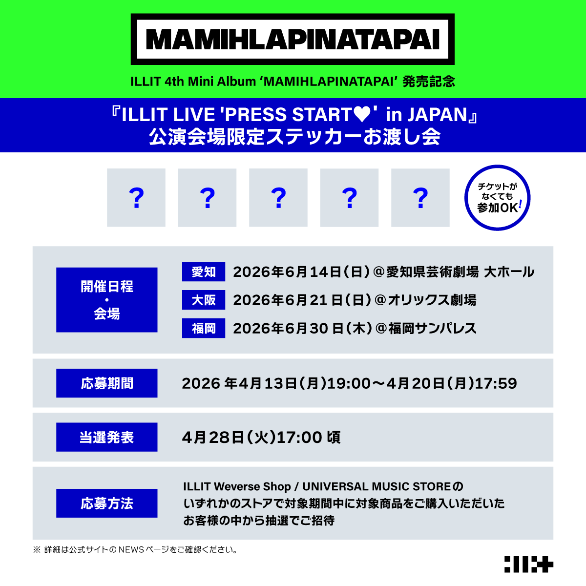 ILLIT Weverse ShopとUNIVERSAL MUSIC STOREの各ストアで下記期間中に対象商品をご購入いただいたお客様の中から、抽選で6月14日(日)愛知公演終了後、6月21日(日)大阪公演終了後、6月30日(火)福岡公演終了後に行う会場限定ステッカーお渡し会にご招待いたします。