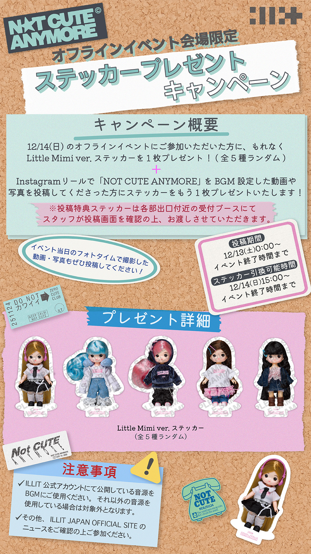 ILLIT 1st Single Album 'NOT CUTE ANYMORE’のリリースを記念して、オフラインイベント会場限定ステッカープレゼントキャンペーン&Instagram投稿キャンペーンを開催いたします。