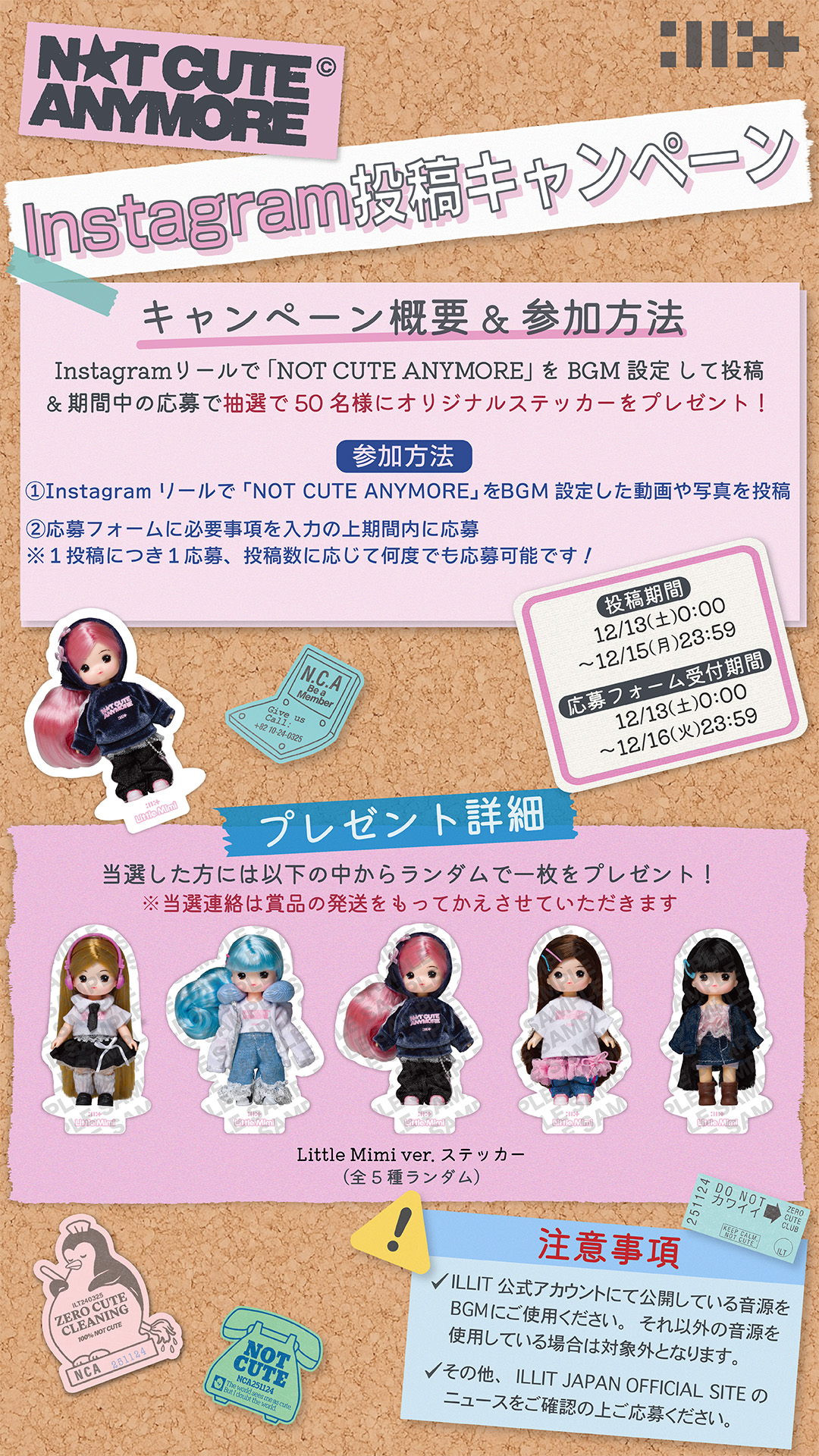 ご自身のInstagramアカウントに、ILLIT 1st Single Album 'NOT CUTE ANYMORE’収録「NOT CUTE ANYMORE」をBGM設定し、動画または写真をリールへ投稿された方から抽選で50名様に、『NOT CUTE ANYMORE’ Little Mimi ver. ステッカー』をランダムで1枚プレゼントします。