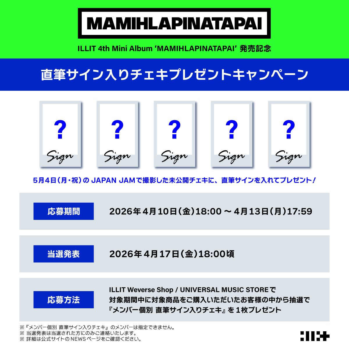 ILLIT 4th Mini Album 'MAMIHLAPINATAPAI’の発売を記念して、5月4日(月・祝)に行われるJAPAN JAMにて撮影したメンバー個別 直筆サイン入りチェキプレゼントキャンペーンが決定いたしました!